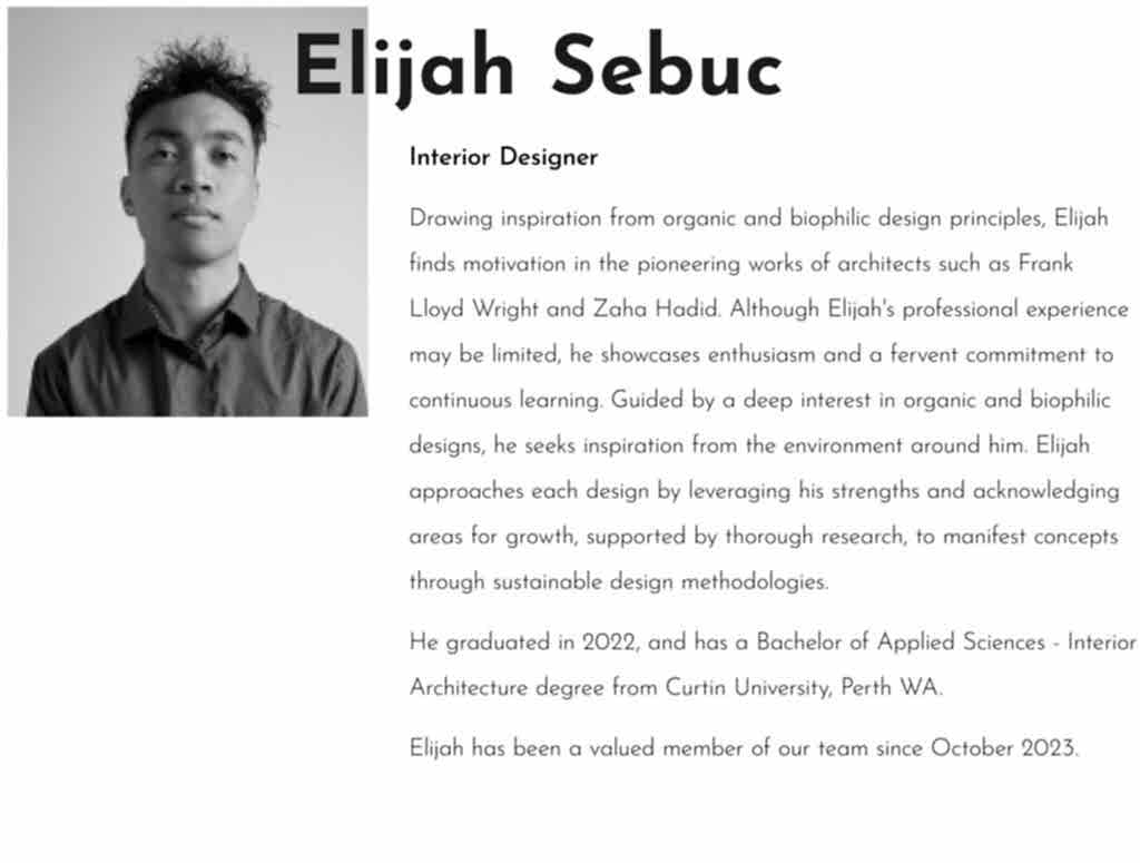 “I am an individual who takes inspiration in organic and biophilic designs, following the works of Frank Llyod Wright and Zaha Hadid. I tackle each design with a creative but efficient approach. Utilizing strengths and weaknesses, applying knowledge, and acquiring detailed research, each design brings concepts and ideas to life through smart and sustainable design practice.”